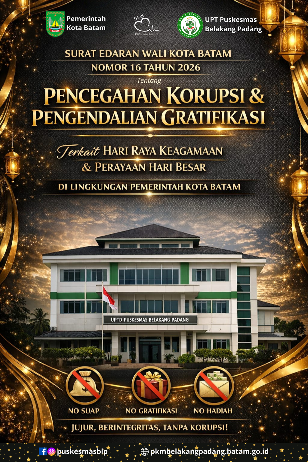 Menindaklanjuti Surat Edaran Wali Kota Batam Nomor 16 Tahun 2026 tentang Pencegahan Korupsi dan Pengendalian Gratifikasi terkait Hari Raya Keagamaan atau Perayaan Hari Besar lainnya, UPT Puskesmas Belakang Padang menyatakan komitmen untuk mendukung upaya pencegahan korupsi di lingkungan Pemerintah Kota Batam.