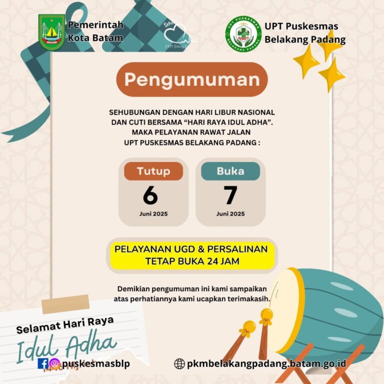 Attention Please…!!!Hallo Sahabat Sehat Upt Puskesmas Belakang Padang Sehubungan Dengan Libur Nasional Dan Cuti Bersama "Hari Raya Idul Adha"Maka Pelayanan...